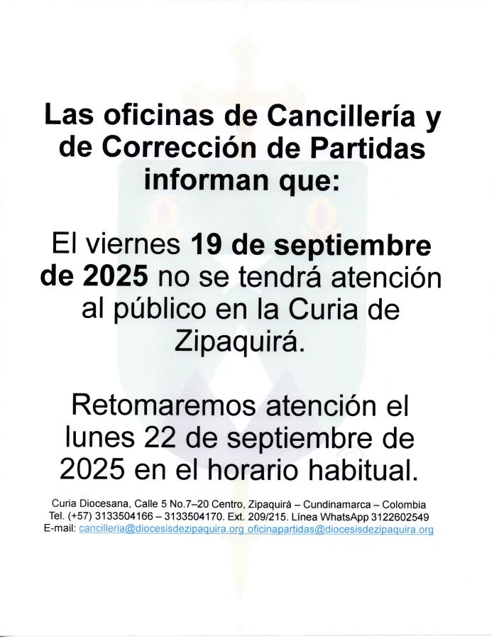 Últimas novedades![]() Aviso: No atención viernes 19 de septiembre 17/9/2025 17:25:44 ![]() Campaña del Diezmo 2025 17/9/2025 14:32:18 ![]() Fiesta patronal, 15 de agosto 12/8/2025 9:35:59 ![]() Ordenación episcopal de Monseñor Jorge Malpica, 02 de agosto 29/7/2025 14:28:0 ![]() Importante: Atención 11 de julio 8/7/2025 11:31:40 ![]() Ordenaciones - 14 de junio 5/6/2025 13:55:40 ![]() Eucaristía en memoria del Santo Padre Francisco, 24 de abril 23/4/2025 19:25:21 ![]() Recordando al Santo Padre Francisco 21/4/2025 14:9:5 ![]() Colecta 17 de abril 16/4/2025 12:24:10 ![]() Misa Crismal - jueves 10 de abril 9/4/2025 8:27:55 ![]() Importante: Atención 11 de abril 7/4/2025 8:29:51 ![]() Importante: Atención 10 de abril 7/4/2025 8:27:46 Ver más novedades |